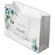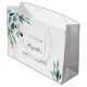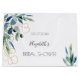 En chic vit bakgrund. Dekorerad med akvarellmålad eucalyptusgrönska och gyllt lövverk. Personifiera och lägg till ett datum och brudens namn.