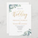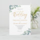 En vacker grönt och guld eucalyptus med kalligrafinginbjudan till bröllopsbröllop i guld.