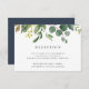 Designad för att samordna med vår Eucalyptus Grove bröllopssamling, har detta frodiga botaniska mottagningskort en spray av akvarellblad och grön eukalyptusväxt, som pryds av era mottagningsdetaljer, tidpunkt och adress.