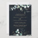 Den här eukalyptus blommigt-blåa, traditionella bröllopsinbjudan är perfekt för ett bröllop. Den här konstnärliga utformningen har handritad blommigt från guld och grönt av eukalyptus i en mörk blått bakgrund, som inspirerar naturskönheten.
