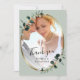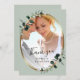 Eucalyptus Elegant Script Sage Photo Bröllop - tackkort.. Tack vare vårt bröllop-eucalyptus-foto i eleganten har du ett guld metallisk ovala ram som är märkt med Eucalyptus-löv som har ett framväxande hölje och som gränsar till ett foto av bruden och groomen på en ljusskygg grönt. Fotot placeras på ett lagrar under en vit genomskinlighet för att "tona" färg vid grund något så att texten "Tack" och bruden och groomen namn som läggs ovanpå kan läsas. Du kan behålla eller revidera texten för kortets visningar för ditt personliga tack. All exempeltext kan enkelt revideras med egen information om anpassningsmallen. En del av en bröllop-svit med samordnande tillbehör inom samma tema för ovaler för eukalyptus guld.
