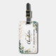 En vit snyggt bakgrund. Dekorerad med eukalyptus greenery, guldblad och faux glitter stoft från guld. Anpassa och lägg till ditt första namn, monogram initialer och fullt namn. Namn är skrivet med ett handskript i stil. Tillbaka: lägg till kontaktinformation.