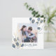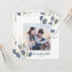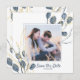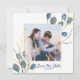 Enkelt och klassigt är dessa bröllop spara datum perfekten för att meddela alla era vänner och familjer om er snart stora vår, sommar, fall eller till och med den stora vinterdagen firande. Har hand-målad eucalyptus grenar med guld löv bakom och ett vitt och blått gräns som omger en fotomall. Baksidan har samma utformning av blommigten. All blå text är anpassade.