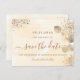 En gyllene akvarell bakgrund dekorerad med gyllene eukalyptus bladverk och konstgjort guld glitterdamm. Anpassa och lägg till datum, plats och era namn. Gyllene färgade bokstäver. Texten: Spara datum är skriven med en stor trendig handstils skrift.