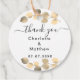 Dekorerad med guldeukalyptus sprigs. Med texten: Tack, skriven med ett modernt handskript i stil med dekorationer. Anpassa och lägg till namn och bröllop-datumet.