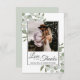 De vackra bröllop-tackkorten innehåller ditt foto omgivet av handmålade vattenfärgsprickor av eukalyptus löv och löv i nyans, moss och sage grönt. Rubriken lyder: Kärlek och Tack, med namnen nedan. Baksidan har en bukett av samma gigantiska form som är bunden av en vit satängbuk samt en anpassningsbar och namnteckning. Det här tackkortet är enkelt, rustiskt och elegant. Det är det perfekt sättet att låta dina vänner och familj få veta hur mycket du uppskattar deras kärlek och stöd.
