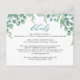 Anpassa bröllop med vårt Eucalyptus Löv informationskort för Bröllop. Med elegantens eukalyptus-accenter kompletterar detta kort på ett utmärkt sätt dina inbjudningar och ger viktig information som platsanvisningar och händelsens tidsinställningar. Förbättra dina gästers upplevelse med en aning natursofistikerad och se till att alla detaljer förmedlas perfekt.