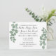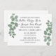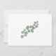Fin inbjudan har färska gröntar med eukalyptus löv över ren vit bakgrund både fram och bak. Perfekt för vår, sommar, utomhus eller grönt bröllop.