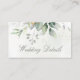 Vackra bröllop-detaljkort med vattenfärgad eukalyptus och guld löv.