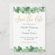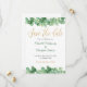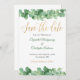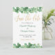 Ett vackert guld och grönt eucalyptus-kort för bröllop spara datum. Lägg till namn och datum och ställe i bröllop.