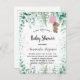 För en babydusch, fira en flicka. En söt liten nalle med rosa ballong, eukalyptus grey och grönt gnistor. Anpassa och lägga till uppgifter om namn i mamma till namn och party. Namn och texten: Baby Shower är skrivet med ett handskript i stil