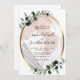 Eucalyptus Photo All in One QR Code OSA Guld bröllopsinbjudan... Vår "QR Code OSA"-inbjudan till ett botaniskt bröllop innehåller en guld metallisk oval ram som är förskönad med sage och emerald grönt eucalyptus löv som gränsar till ett foto av bruden och groomen på en skarp vit bakgrund. Bilden placeras på ett lagrar under en vit genomskinlighet för att "tona" färg något så att texten överst är läsbar. Baksidan av inbjudan visningar även bröllop webbplats QR-kod och webbplatsens egen URL, vilket gör att dina inbjudna lätt kan OSA online och visa alla uppgifter som normalt skickas i ett bröllop-paket. Den här moderna bröllopsinbjudan från stil var designad för att vara både elegant- och budgetmedveten.. för att inte nämna tidsbesparing. All exempeltext kan enkelt revideras med egen information om anpassningsmallen.