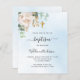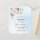 A blå himmel som dekorerad med eukalyptus greenergiy, en vit peony, blomma och gyllene löv. Personalisera och barn namn och ceremoniuppgifter. Svart färgad brev. 1 lakan = 1 inbjudan tryckt kant till kant.