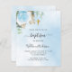 A blå himmel som bakgrund dekorerad med eukalyptus greenery, ljusblå ro och guldlöv. Personalisera och barn namn och ceremoniuppgifter. Svart och guldfärgad färgad brev. 1 lakan = 1 inbjudan tryckt kant till kant.