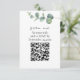 Gör det enkelt för dina gäster att ta sig till OSAN och få tillgång till information om bröllop med det här eleganten Eucalyptus QR-kodkortet. Det här kortet har en mjuk vattenfärgsgrön design, modern kalligrafi och en skannerbar kod och är perfekt för teknikvilt par som vill effektivisera sin OSA processaa. Perfekt för bröllop, trädgård eller minimalistiskt, det blandar bekvämligheten med ett sammanhängande botaniskt stil.