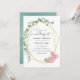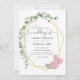 Trendigets geometriska eukalyptus grönenery och den bröllopsinbjudan rosa ros med guld-geometrisk ram och myntvattenfärg tvättar omvänd.