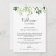 Denna eukalyptus enkla blommigt bröllop välkomnar brev är perfekt för ett grönt bröllop. Konstruktionen har en konstnärligt handmålad vacker eukalyptus grönt löv som ordnas i geometriska former och inspirerar naturskönheten. Anpassa fronten med ett välkomstmeddelande till dina gäster och till namn. Anpassa baksidan med schemat för händelser och annan användbar information.