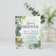 Greenery skogsbjudkort med dammig grön/blå akvarelltvätt, botaniska eucalyptusblad, stänk av falsk guldfolie, skogsdjur för bebisar och en modern mall för baby shower-fest som är enkel att anpassa.