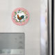Underbar magnet för ditt hyttdekortema - har diagonalt rött ljus bakgrund med vattenfärgen eukalyptus wandeand och färgstark illustration av tupp
