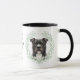 "LOVE MY AMSTAFF DOG" declares this mug for the American Staffordshire Terrier dog owner. Each side of the mug has a watercolor portrait of a black Amstaff dog framed by soft green watercolor eucalyptus leaves. Between the two images is the text, which may be easily customized, or even removed by you, and your monogram or name.