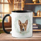 "LOVE MY BASENJI DOG" declares this mug for the proud Basenji Hound dog owner. Each side of the mug has a beautiful portrait of a Basenji framed by soft green watercolor eucalyptus leaves. Between the two images is the text, which may be easily customized, or even removed by you, and your monogram or name.