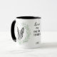 "LOVE MY BOSTON TERRIER" declares this mug for the proud Boston Terrier dog owner. Each side of the mug has an adorable portrait of a black and white terrier framed by soft green watercolor eucalyptus leaves. Between the two images is the text, which may be easily customized, or even removed by you, and your monogram or name.