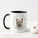 "LOVE MY CAIRN TERRIER DOG" declares this mug for the proud Terrier dog owner. Each side of the mug has a beautiful watercolor portrait of a Cairn Terrier dog framed by soft green watercolor eucalyptus leaves. Between the two images is the text, which may be easily customized, or even removed by you, and your monogram or name.