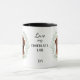 "LOVE MY CHOCOLATE LAB" declares this mug for the Labrador Retriever dog owner. Each side of the mug has a watercolor portrait of a beautiful chocolate brown Lab framed by soft green watercolor eucalyptus leaves. Between the two images is the text, which may be easily customized, or even removed by you, and your monogram or name.