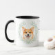 "LOVE MY PEMBROKE WELSH CORGI" declares this mug for the proud Corgi dog owner. Each side of the mug has a beautiful portrait of a Pembroke Welsh Corgi Dog framed by soft green watercolor eucalyptus leaves. Between the two images is the text, which may be easily customized, or even removed by you, and your monogram or name.