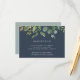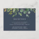Designad för att samordna med vår eucalyptusdunge bröllopssamling, har detta frodiga botaniska mottagningskort en spray av akvarellblad och grön eukalyptusväxt, som prydar era mottagningsdetaljer, tid och adress, i vitt på en rökig marinblå bakgrund.