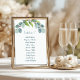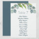 Botaniska eukalyptusblad, bröllopsbord nummer på pappersark med namnlista. Ljusgrönt papper - visas här i det tjockaste 17,5 vikt, i största storlek - har fet, blågrön tryckt teckensnitt högst upp för bordnumret och en lista med namn i handskriven stil under. Kombinera namn om det behövs eller lämna mellanrum. En böjd girlang av grönska pryder toppen. Naturtemat fungerar för många typer av bröllop, inklusive rustika och utomhusbröllop. Häng upp på någon form av bakgrund som passar ditt bröllopstema för att på ett enkelt sätt hjälpa gästerna att hitta sina bord. Baksidan är tom i enfärgat mörkblått-grått. Om större papper behövs kan denna design överföras till en affisch eller 8x