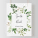 Denna enkla bruna blomsterbukett gästbokssköld med eukalyptusmotiv är perfekt för ett grönskande bröllop eller brudvisning. Designen har konstnärligt handmålade vackra eukalyptusblad i grönt arrangerade i geometriska former som inger naturlig skönhet.