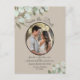 Denna rustika bröllop Bevara datum-vykort har en elegant akvarelldesign med ditt foto i en oval ram omgiven av handmålade kvistar av eukalyptusblad och grönska på en brun eller taupe bakgrund. Baksidan har utrymme för en valfri webbadress tillsammans med en söt "rita in oss"-grafik och en landsbygd bukett av bladverk bunden med en vit rosett. Modern, bohemisk och chic, detta kort är säkert att behaga.