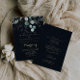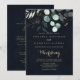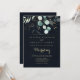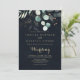 Denna eukalyptus guld blommiga blå fram- och baksida bröllopsinbjudan är perfekt för ett rustikt bröllop. Denna konstnärliga design har handritade guld blommor och akryl eukalyptusgrönska på en mörkblå bakgrund som inspirerar till naturlig skönhet.