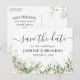 Botanisk bröllop spara datum postkort med en stilren vit bakgrund, akvarell gröna eukalyptus blad, guld glitter accenter och en textmall för att spara datum som är enkel att anpassa.