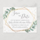 Fira i stil med dessa stilrena och mycket trendiga bröllops-kort för att spara datum. Designen har en chic guld folie geometrisk ram med trendig typsnittsformulering och frodig akvarell eukalyptus grönska. Denna design är enkel att anpassa med din speciella händelse formulering och dina gäster kommer att vara överlyckliga när de får dessa fantastiska vykort.