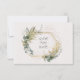 Ett vackert bröllop spara datum sätts på vit bakgrund med Eucalyptus Löv i ett guld geometriskt ram. Det här Spara datumet ingår i en uppsättning produkter som matchar designen och är perfekt för ett större elegant bröllop i en kyrka.
