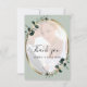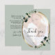 Eukalyptus Salvia Fotoöverlägg Guld Metallisk Oval Bröllopstackkort... Vårt eleganta eukalyptus-fotobröllopskort har en guldmetallisk oval ram prydd med smaragdgröna eukalyptusblad som gränsar till ett foto av bruden och brudgummen på en ljus salvia grön bakgrund. Ditt foto kommer att placeras på ett lager under en vit transparens för att "tona ned" färgerna något så att "Tack" texten och brud och brudgummens namn överst är läsbara. Baksidan av kortet visar text du kan behålla eller revidera för ditt personliga tackmeddelande. All exempeltext kan enkelt revideras med din egen information på personaliseringsmallen. Del av en bröllopssvit med koordinerade tillbehör i samma eukalyptus sal
