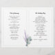 Vikta bröllopsprogram med eukalyptusblad design. Visas på filt papper, eller ändra det, med fyra "sidor" att anpassa. Det 21,59 x 27,94 cm stora pappret viks efter köpet. På framsidan står exempel titeln "Välkommen till vigseln som förenar" med fullständiga namn (som du väljer) på brud och brudgum. Inkluderar datum, tid och plats längst ner. Dekorerad med en kvist blågrå blad. Inuti programmet har vänster sida text för "ordning för ceremonin" och "bröllopsfesten". Fler blad och en kvist lavendel dekorerar mitten inuti. På baksidan av programmet finns ett stycke för att skriva ett personligt meddelande till bröllopsgästerna. En lätt bladkr
