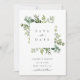 Denna bröllopsinbjudan för att spara datum har målad akvarell eukalyptusgrönska, gröna blad och fyrkantig ram. För mer avancerad anpassning av denna design, vänligen klicka på "Anpassa ytterligare". Matchande artiklar finns också tillgängliga.