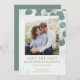 Elegant akvarell eukalyptus grönska bröllop spara datum dubbelsidigt kort. Med akvarell eukalyptusblad. Denna designmall har en en-fotolayout.