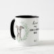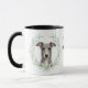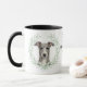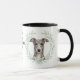 "ÄLSKAR MIN GREYHOUND" står det på denna mugg för hundägare. Varje sida av muggen har ett porträtt av en vacker grå Greyhound hund ramad av mjuka gröna akvarell eukalyptusblad. Mellan de två bilderna finns texten, som lätt kan anpassas eller till och med tas bort av dig, och din monogram eller namn.