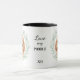 "ÄLSKAR MIN PUDEL" står det på denna mugg för ägare av Pudel hundar. Vardera sidan av muggen har en bild av en söt liten Pudel hund omgiven av mjuka gröna akvarell eukalyptusblad. Mellan de två bilderna finns texten, som lätt kan anpassas eller till och med tas bort av dig, och din monogram eller namn.