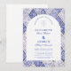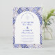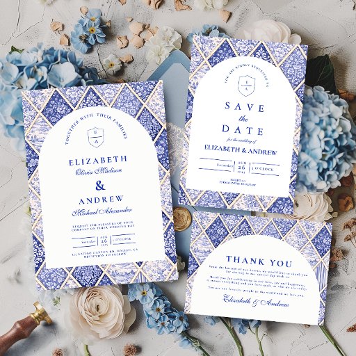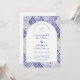 A timeless blue and white design inspired by classic Delft porcelain and French toile patterns. The patchwork tile border combines delicate florals, stripes, and ornamental motifs that evoke vintage European ceramics. A soft arched panel in the center keeps the layout refined and elegant while allowing the details of the porcelain-inspired pattern to frame the celebration beautifully. Perfect for couples planning a sophisticated blue and white wedding with traditional European charm.