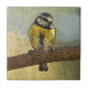 En design av en blått, gult, svartvit bluetit på en gren med en pastellfärgad blått- och gultbakgrund.
