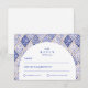 En tidlös blå och vit design inspirerad av klassiskt Delft-porslin och franska toile-mönster. Kanten med patchworkplattor kombinerar ömtåliga blommor, ränder och ornamentala motiv som frammanar vintage europeisk keramik. En mjukt välvd panel i mitten håller layouten raffinerad och elegant samtidigt som den tillåter detaljerna i det porslinsinspirerade mönstret att ramma in firandet vackert. Perfekt för par som planerar ett sofistikerat blått och vitt bröllop med traditionell europeisk charm.
