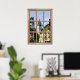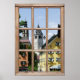 Poster som ser ut som ett fönster - Österrikes stad Österrike har ett sådant söt städer med skarpt målade byggnad och lökdomkyrkor. Föreställ dig att du kunde vakna med den vyn... Du kan med bild som ser ut som ett fönster! Utanför träfönstret är ram en underbar gata som visar två städer byggnad, en söt gult och en varm orange, med sina gröntar. Förutom det kan du se klockan torn och lökens kukspire. Tagen i den vackra staden Kitzbuehel i de österrikiska Alpernorna i Europa.