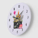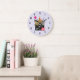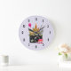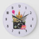 En klocka med en grafisk illustration med europeiska landmärken som lutande torn i Pisa, Big Ben, Eiffeltornet osv... En varmluftsballong i himlen och en dubbeldäckare buss, med en stor kamera. Ett frimärke med de egyptiska pyramiderna fast på kameran.