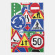 En collage av europén trafikerar tecken. Här är ett roligt, och den unika handduken för någon, som älskar, reser i Europa, speciellt roadtrips.