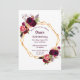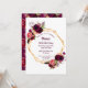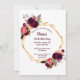 På framsidan: En inbjudan till en 50:e eller någon annan födelsedagsfest. En vit bakgrund med faux guld geometric ram. Dekorerad med mörkens lila och burgundblommor, ro och boho stil fjädrar. Mallar för uppgifter om namn, ålder och party. Namn är skrivet med ett handskript stil, lila färgad brev. Bakåt: Burgundy-bakgrund och ett blommönster.